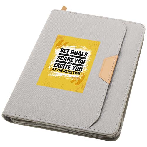 Teczka z notatnikiem do pisania Nomumi w formacie A5 o zaokrąglonych rogach to poręczny i niezbędny w biurze gadżet, wykonany z plastiku pochodzącego z recyklingu. Zawiera 64 kremowe kartki w linie z papieru o gramaturze 80 g/m22 i jest wyposażona w zapięcie na suwak, szlufkę na długopis i kieszeń harmonijkową.