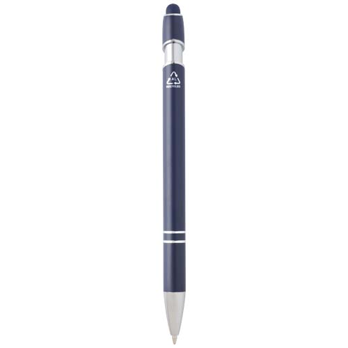 Długopis Kish ze srebrnym wykończeniem ma korpus wykonany z aluminium z recyklingu i rysik dotykowy wykonany z silikonu. Aluminium z recyklingu ogranicza ilość odpadów na wysypiskach śmieci i pomaga chronić zasoby naturalne w celu zmniejszenia emisji gazów cieplarnianych. Kolor tuszu: Niebieski. Żywotność: 800 metrów. Rozmiar stalówki: 1,0 mm.