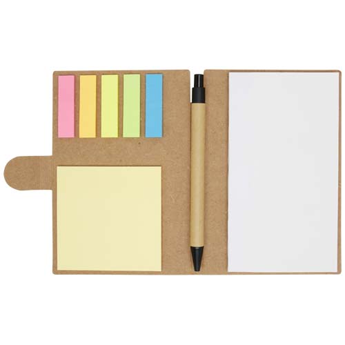 Notes z karteczkami samoprzylepnymi i długopisem Swift to bardzo poręczny dodatek do biura. Zawiera 25 arkuszy białego papieru o gramaturze 70 g/m2 (14,1 x 7,8 cm). W zestawie znajdują się również małe (4,5 x 1,2 cm) i duże (7,5 x 7,5 cm) kolorowe karteczki samoprzylepne. Korpus długopisu wykonany jest z papieru pochodzącego z recyklingu. Kolor tuszu: Czarny. Żywotność: 500 metrów. Rozmiar stalówki: 1,00 mm.