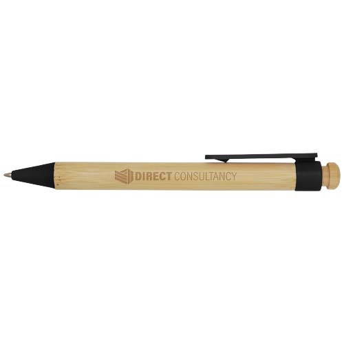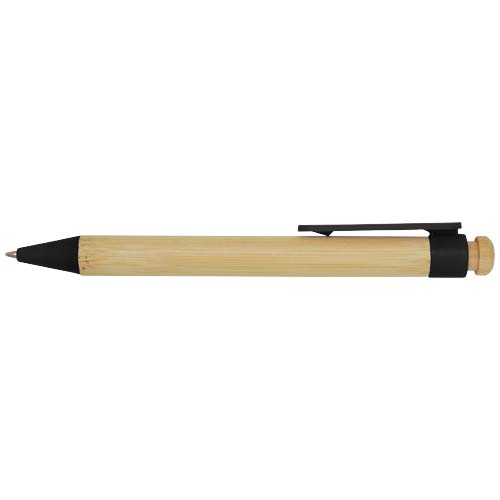 Długopis z klipsem i końcówką z plastiku z recyklingu oraz przyciskiem i korpusem z bambusa. Kolor tuszu: Czarny. Żywotność: 1000 metrów. Rozmiar stalówki: 1,0 mm.