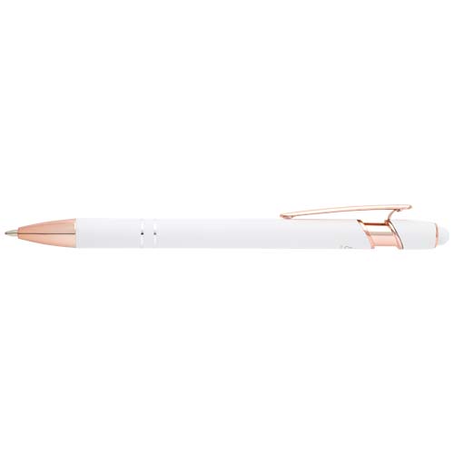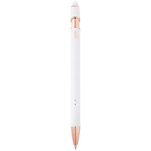 Długopis Nanna z wykończeniem w kolorze różowego złota ma korpus wykonany z aluminium z recyklingu i rysik dotykowy wykonany z silikonu. Aluminium z recyklingu ogranicza ilość odpadów na wysypiskach śmieci i pomaga chronić zasoby naturalne w celu zmniejszenia emisji gazów cieplarnianych. Kolor tuszu: Czarny. Żywotność: 800 metrów. Rozmiar stalówki: 1,0 mm.