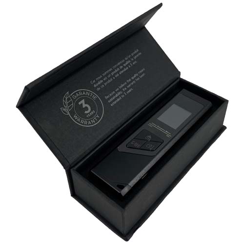 Mini telemetr laserowy jest łatwiejszym, szybszym i dokładniejszym sposobem pomiaru powierzchni, objętości i posiada także funkcję Pitagorasa. Dzięki precyzyjnej technologii laserowej i trybowi pomiaru w czasie rzeczywistym zapewnia niezawodne pomiary do 40 metrów. Telemetr wykorzystuje energooszczędny akumulator litowo-jonowy o pojemności 200 mAh jako źródło zasilania i może mierzyć odległość 2000 razy po pełnym naładowaniu. Jest wyposażony w podświetlany wyświetlacz ułatwiający podgląd pomiaru nawet w ciemnych miejscach. Wymiary: 9 x 2.4 x 1.1 cm. Zapakowany w pudełko upominkowe z papieru z recyklingu (10,2 x 4,2 x 3 cm) z magnetycznym zamknięciem. 3-letnia gwarancja.