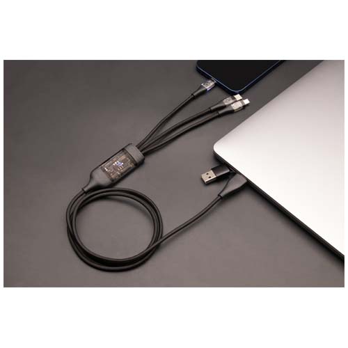 Kabel szybkiego ładowania i przesyłania danych 5 w 1. Wejście: USB-A/USB-C. Wyjście: Micro USB/typu C/Lightning. Szybkie ładowanie: 100 W/5 A. Przezroczyste wtyczki. Cyfrowy wyświetlacz prędkości transferu z przodu i podświetlane logo z tyłu.