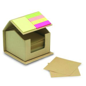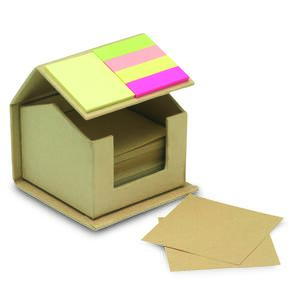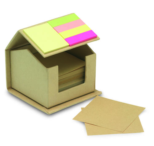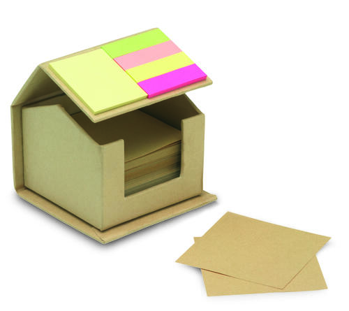 Kartonowe pudełko w kształcie domu, z papieru z surowców wtórnych. Dołączonych 300 kartek papieru z recyklingu i kolorowe karteczki samoprzylepne na dachu.