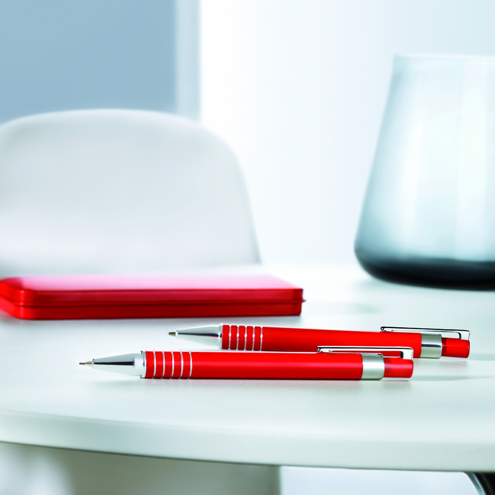 Aluminiowy zestaw do pisania z przyciskanym długopisem z niebieskim wkładem oraz mechanicznym ołówkiem to elegancki gadżet, który doskonale sprawdzi się jako prezent dla osób, które zawsze mają coś ciekawego do napisania.
