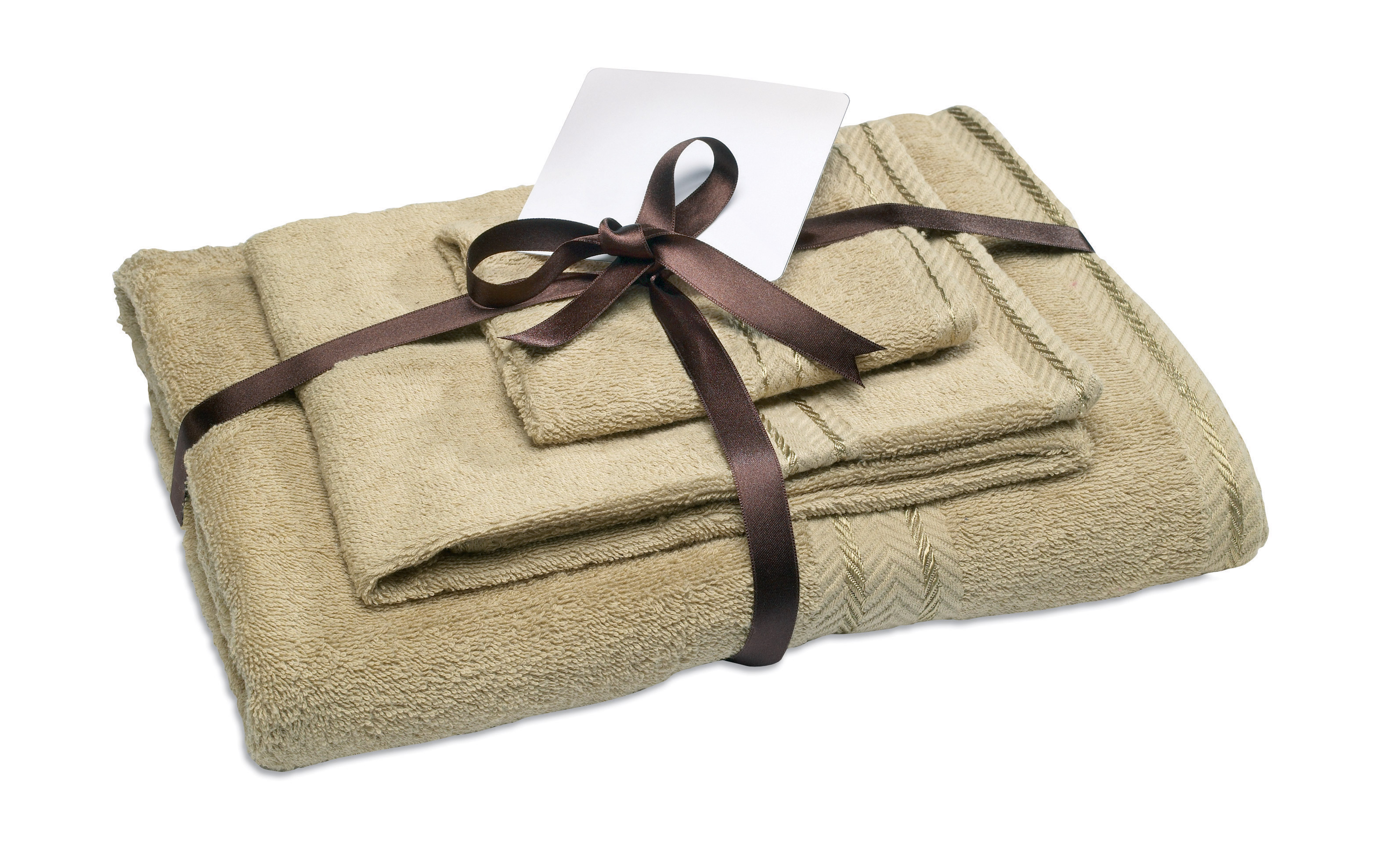 Komplet 3 ręczników kąpielowych w różnych rozmiarach: kąpielowy (137x70cm), zwykły(70x40cm) i mały ( 30x30cm). Ozdobna stylowa wstążka. Materiał: 100% bawełna 380g.