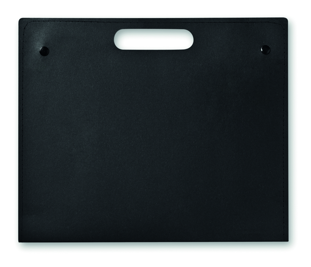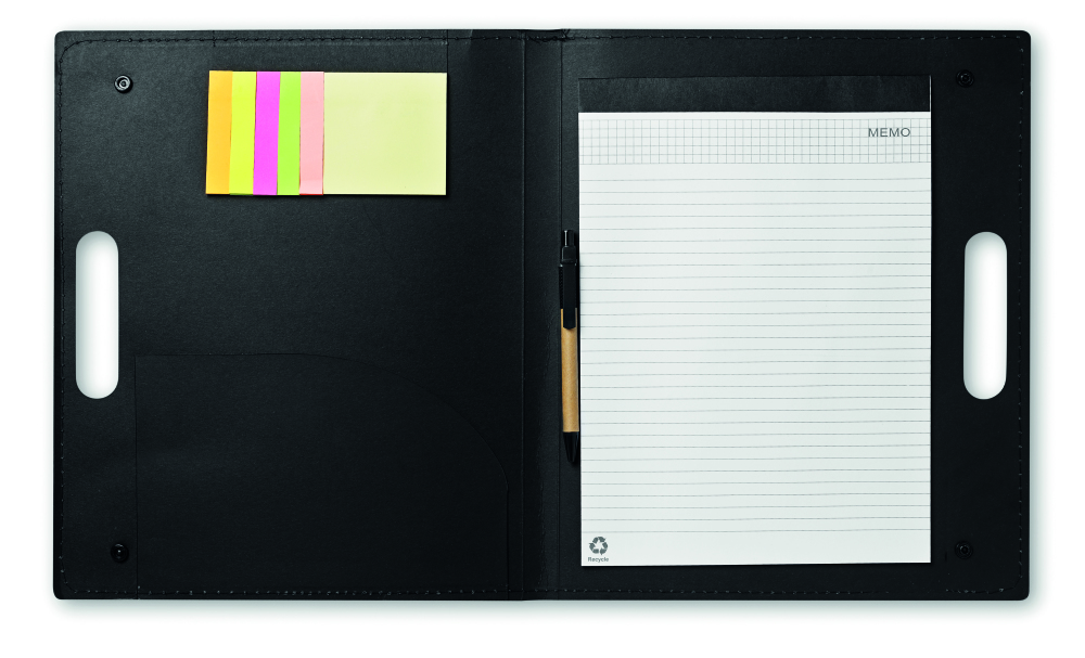 Teczka konferencyjna z kartonu, z 6 kolorowymi samoprzylepnymi karteczkami. Dołączony 20-kartkowy biały blok w linie i długopis z niebieskim wkładem. Zamykana na 2 zatrzaski.