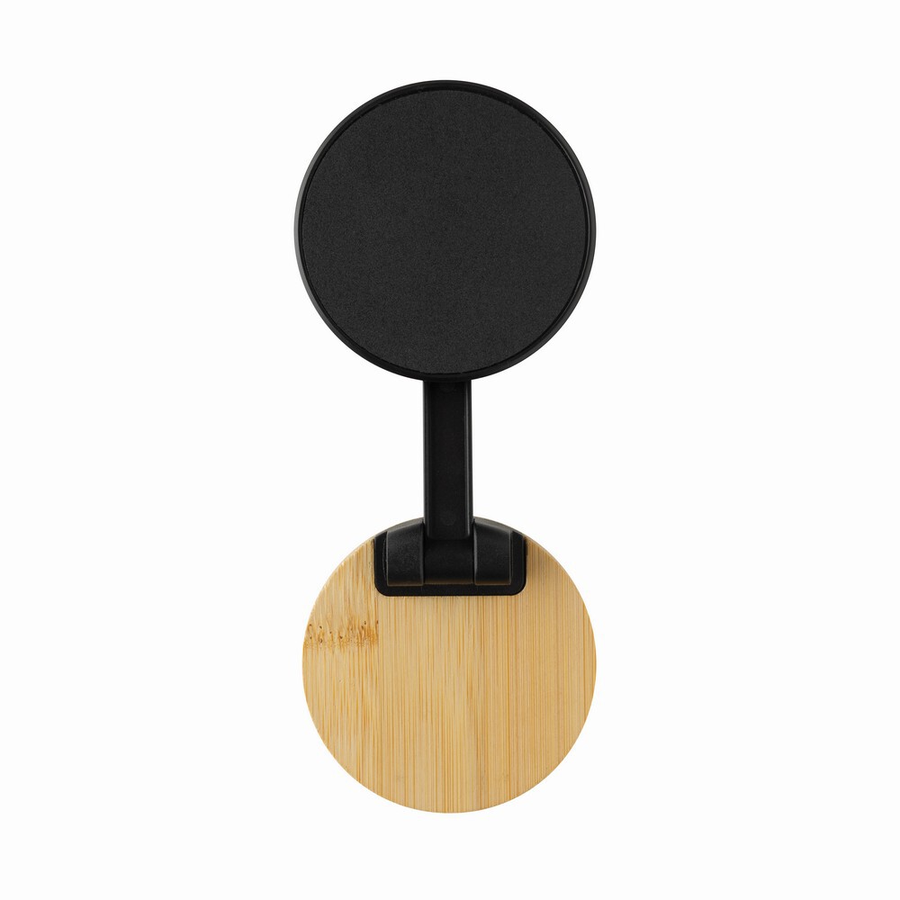 Składany magnetyczny stojak na telefon, wykonany z ABS i naturalnego bambusa z certyfikatem RCS (Recycled Claim Standard) certyfikat RCS zapewnia w pełni certyfikowany łańcuch dostaw materiałów pochodzących z recyklingu