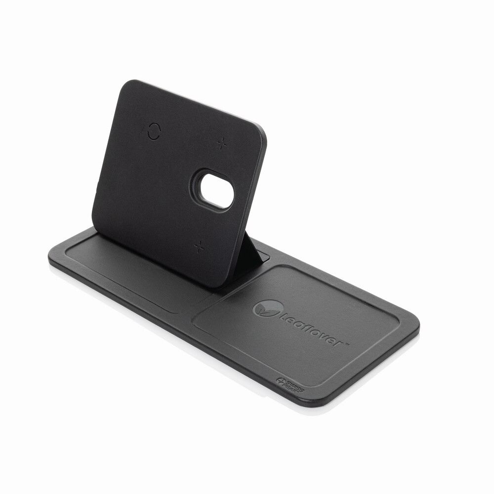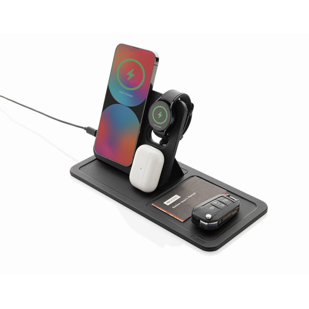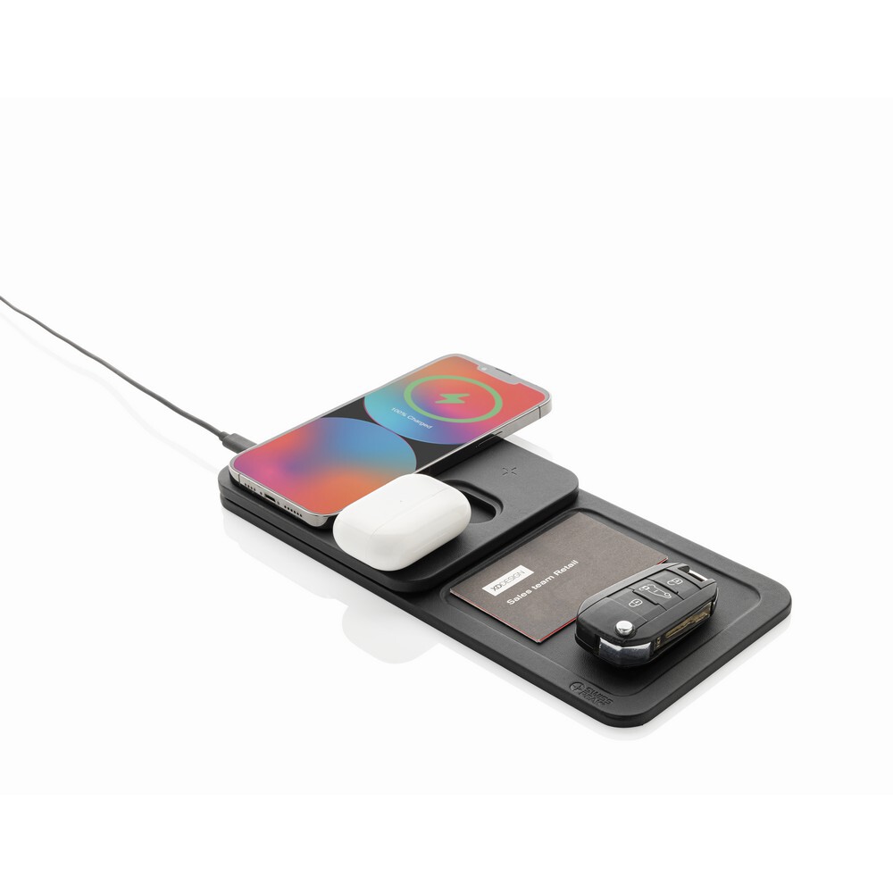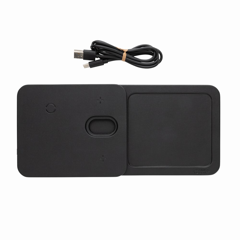 Ładowarka bezprzewodowa 3 w 1 Swiss Peak, wykonana z recyklingowanego PU RCS, elegancka i składana, magnetyczna ładowarka 15W, dodatkowa ładowarka 5W do etui na słuchawki lub innych urządzeń oraz ładowarka 2,5W do smartwatchy (Apple Watch), kabel TPE 120 cm, opakowanie FSC® mix, bez PVC, wejście 9V/3A, wyjście: telefon 15W, słuchawki 5W, zegarek 2,5W