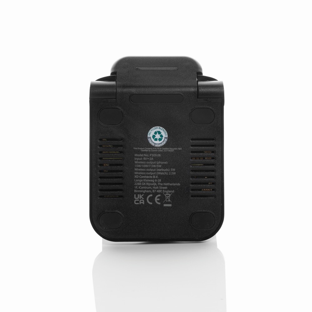 Ładowarka bezprzewodowa 3 w 1, 15W, podstawka pod ładowarkę bezprzewodową 3 w 1 wykonana z ABS pochodzącego z recyklingu RCS, certyfikat RCS zapewnia w pełni certyfikowany łańcuch dostaw materiałów pochodzących z recyklingu, wyposażona w ładowarkę bezprzewodową o mocy 15W i dodatkową ładowarkę bezprzewodową o mocy 5W odpowiednią do słuchawek dousznych lub innych małych urządzeń ładowanych bezprzewodowo, ładowarka bezprzewodowa o mocy 2,5W do smartwatchów (tylko zegarki Apple), składana, w zestawie 120 cm kabel TPE z recyklingu z certyfikatem RCS, zapakowany w opakowanie FSC® mix kraft, produkt i akcesoria w 100% wolne od PVC, wejście: 9V/3A dla optymalnego użytkowania, wyjście telefon 9V/1.1A, 9V/1.67 A/(15W), słuchawki douszne 5V/1A (5W), zegarek 5V/0,5A