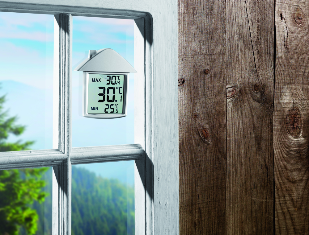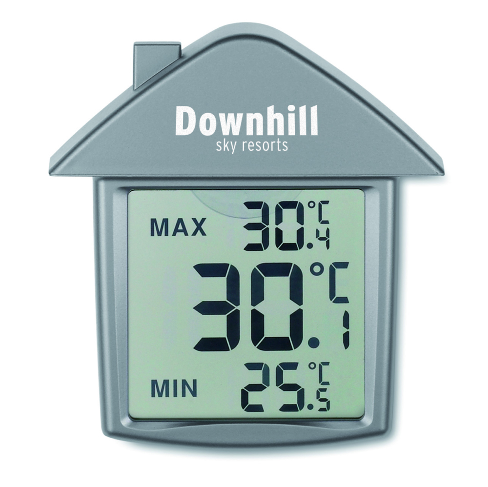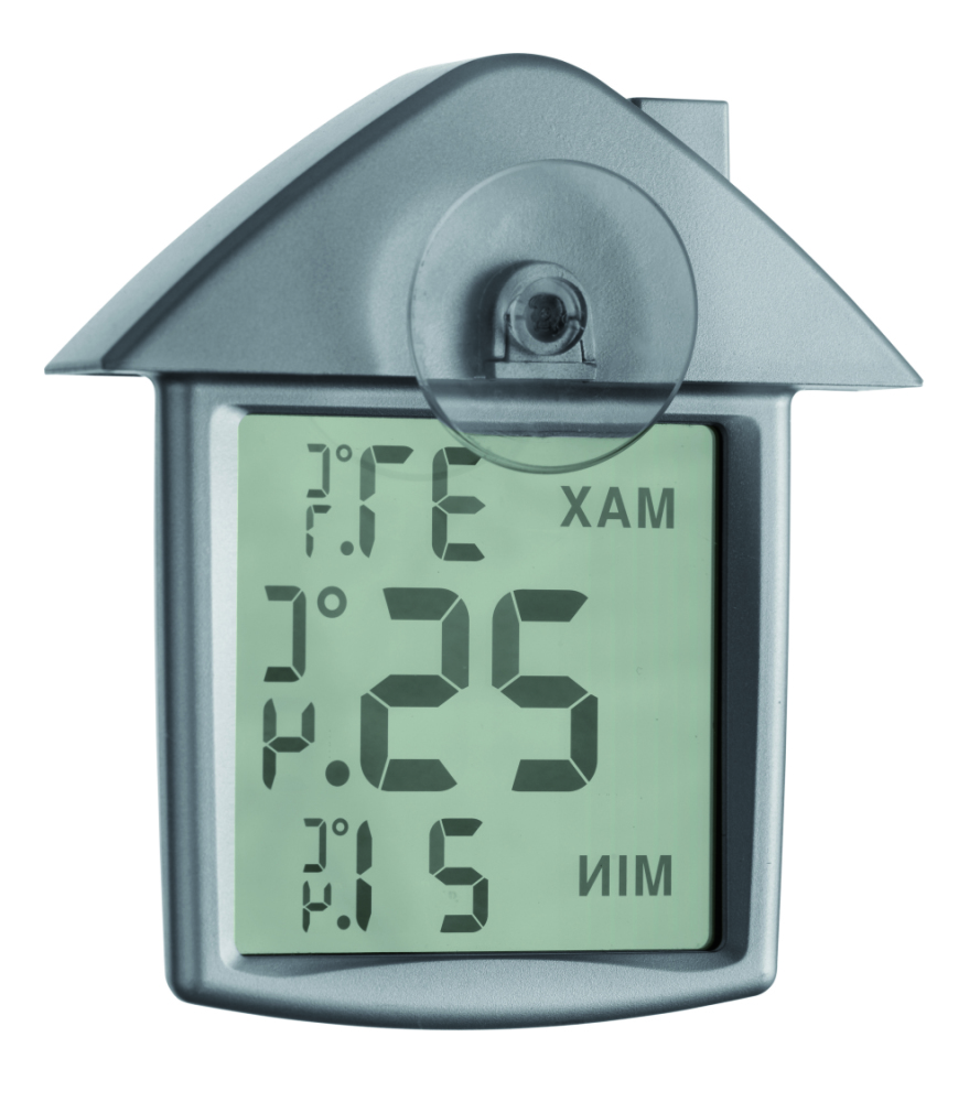 Termometr w kształcie domu, w plastikowej obudowie, z przyssawką. DO użytku wewnętrznego. Zakres temperatur 0-50°C. 1 bateria pastylkowa dołączona. Można zamocować na szklanej lub ceramicznej powierzchni.