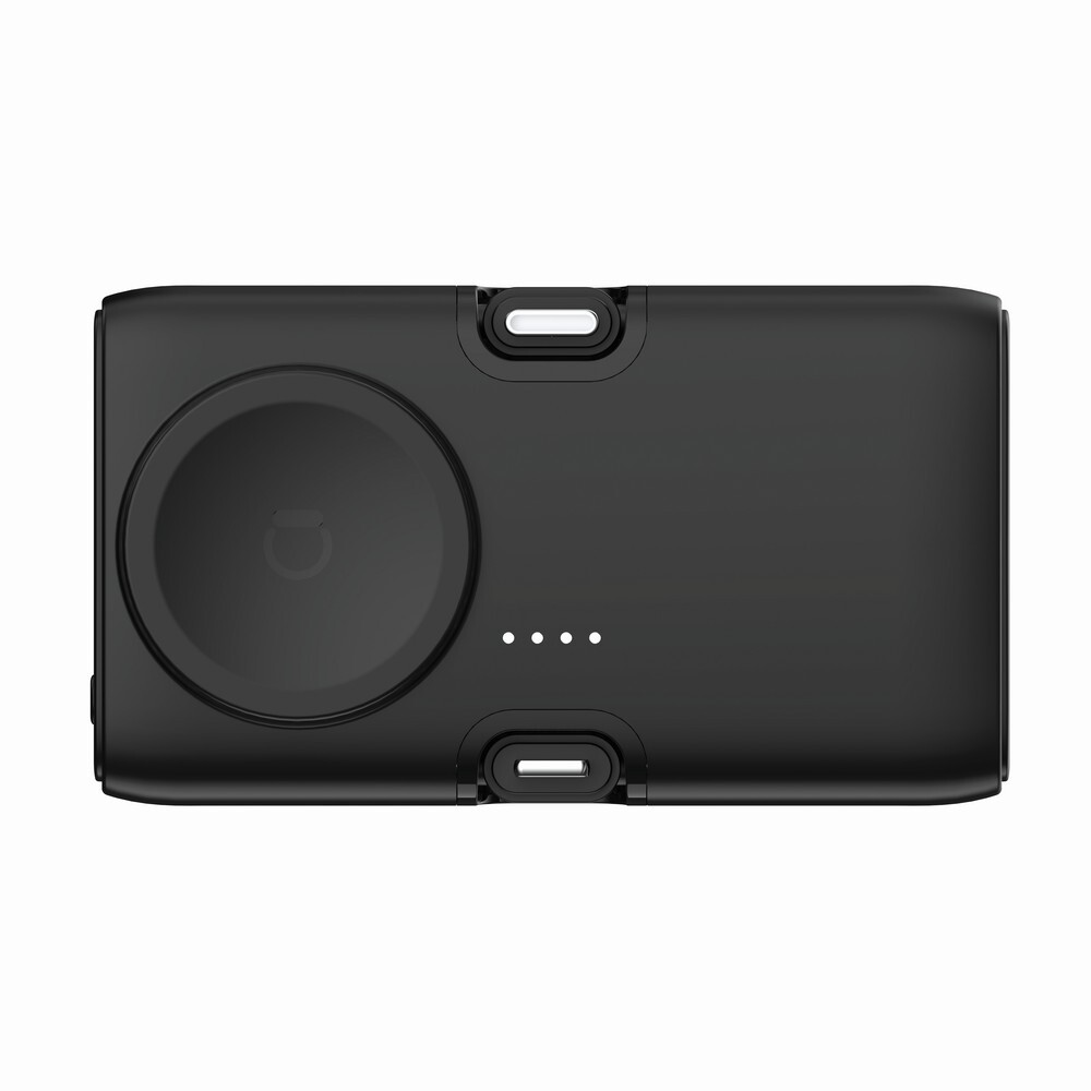 Power bank 5000 mAh, zintegrowana ładowarka bezprzewodowa do zegarka (tylko iOS), szybkie ładowanie do 20W, zintegrowane wyjścia USB-C i iOS, stojak na telefon, wyjście USB-C, działa z urządzeniami posiadającymi możliwość ładowania indukcyjnego, wykonana z ABS z recyklingu, całkowita zawartość materiałów z recyklingu obliczona na podstawie wagi całkowitej produktu: 24%