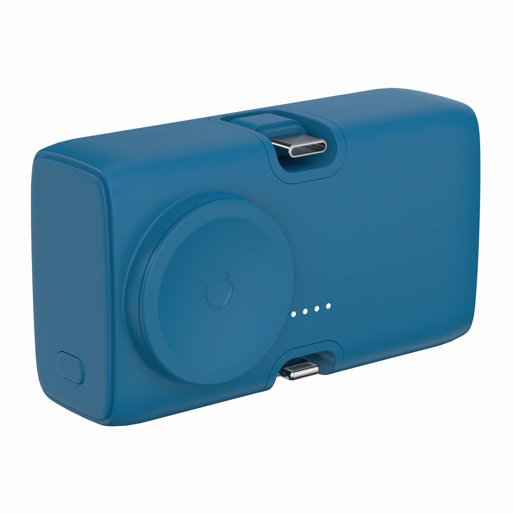 Power bank 5000 mAh, zintegrowana ładowarka bezprzewodowa do zegarka (tylko iOS), szybkie ładowanie do 20W, zintegrowane wyjścia USB-C i iOS, stojak na telefon, wyjście USB-C, działa z urządzeniami posiadającymi możliwość ładowania indukcyjnego, wykonana z ABS z recyklingu, całkowita zawartość materiałów z recyklingu obliczona na podstawie wagi całkowitej produktu: 24%