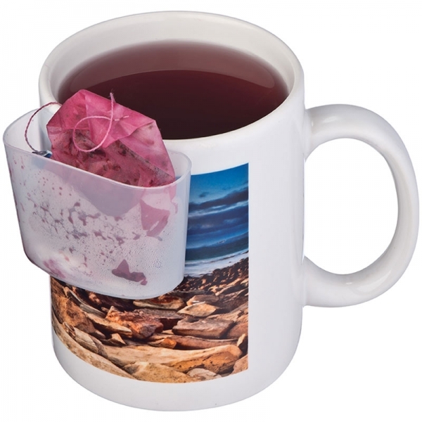 Plastikowy uchwyt, który można założyć na kubek i włożyć do niego np. torebkę herbaty, kostki cukru lub ciasteczko. Pojemnik wykonany w całości z plastiku, dostępny w kolorze transparentnym.