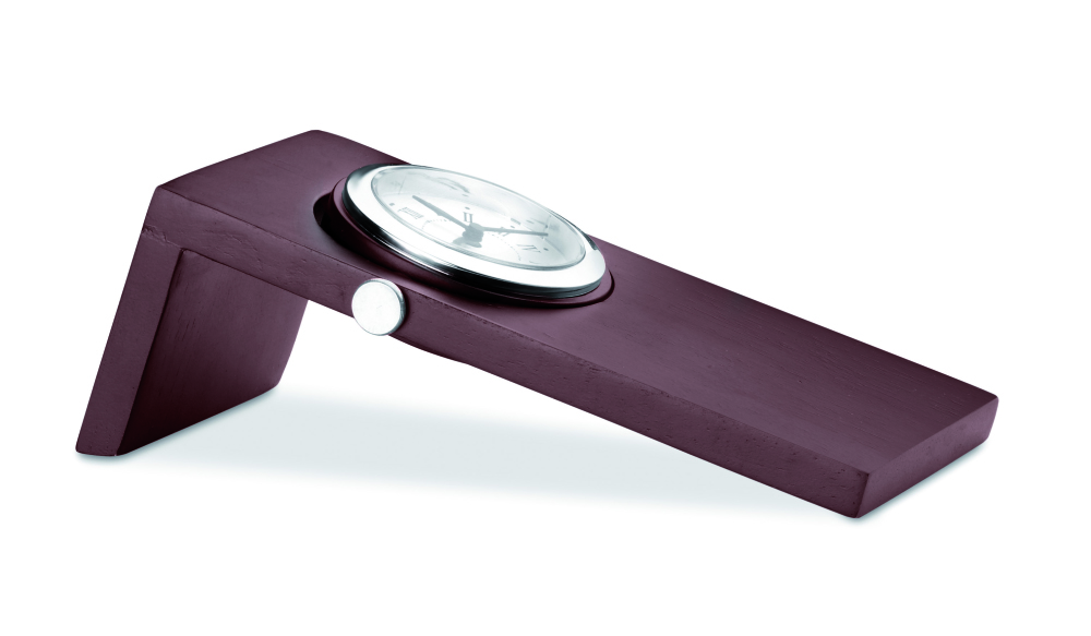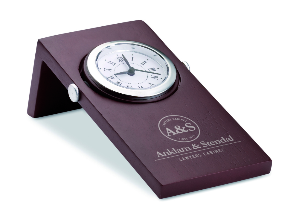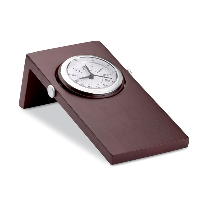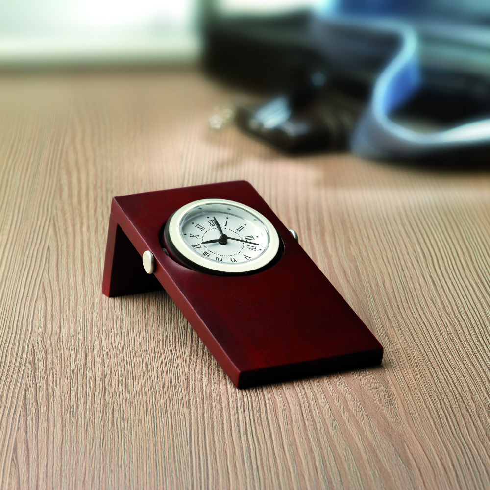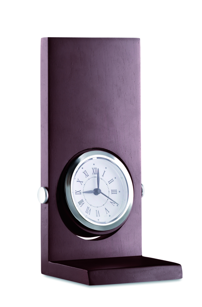 Analogowy zegar na drewnianej podstawie, wykończenie z mahoniu. 1 bateria dołączona.