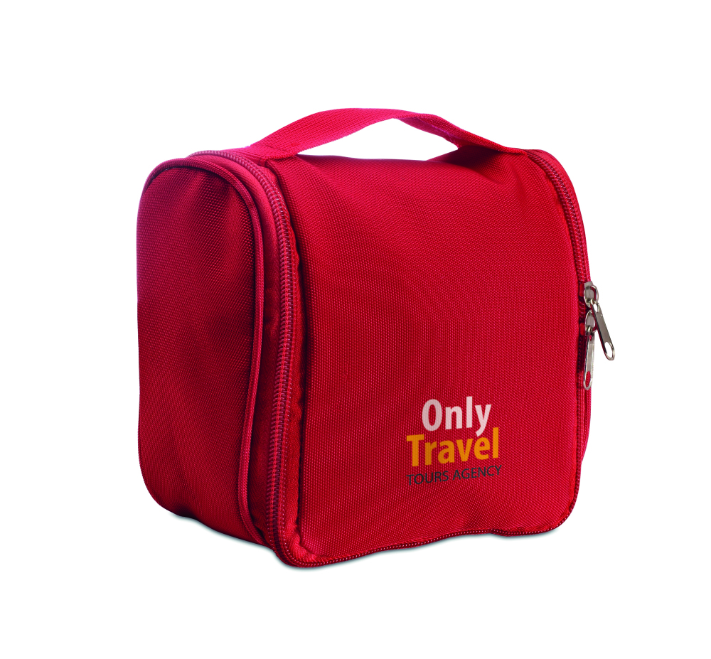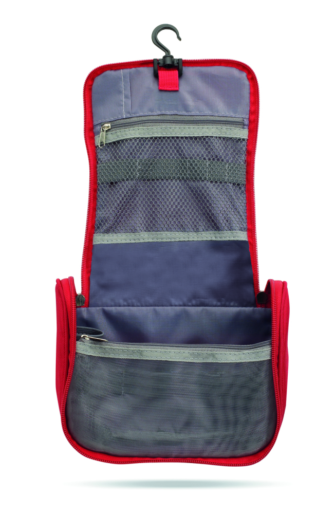 Wisząca kosmetyczka z wieloma przegrodami i siatkowymi kieszeniami. Mocny polyester. Doskonała na podróż.