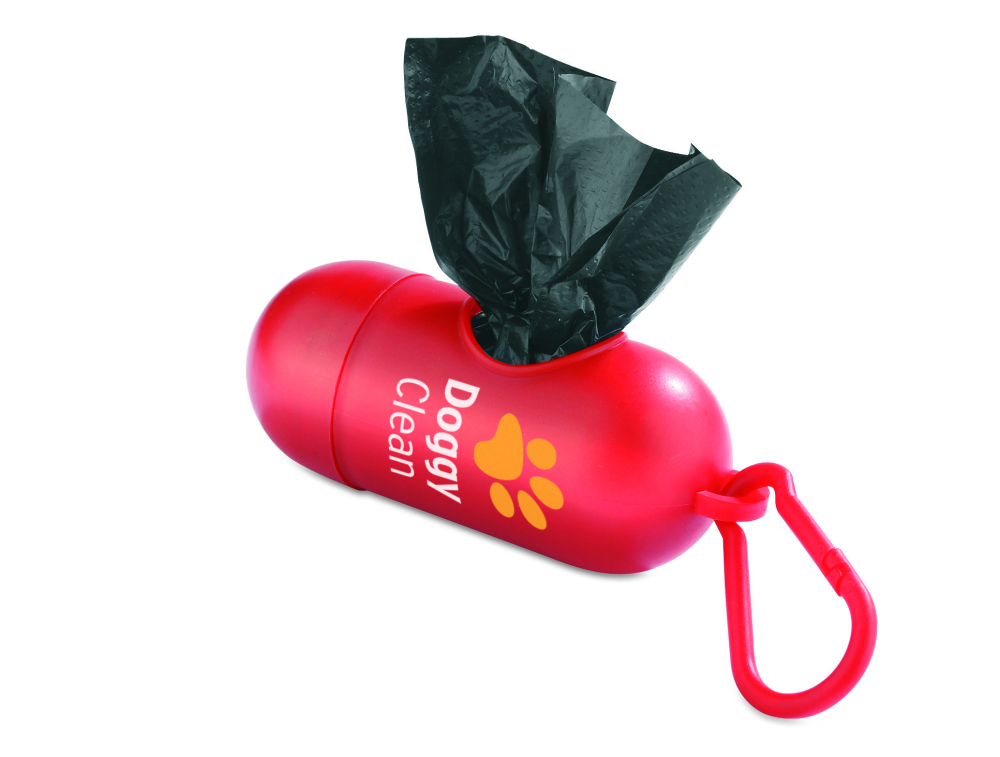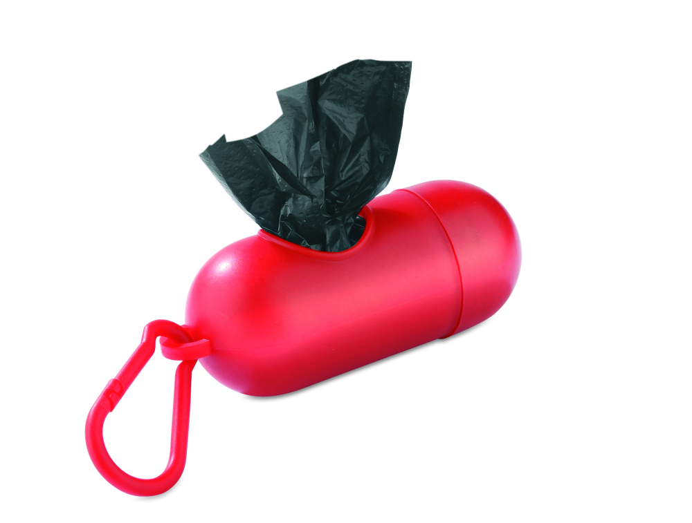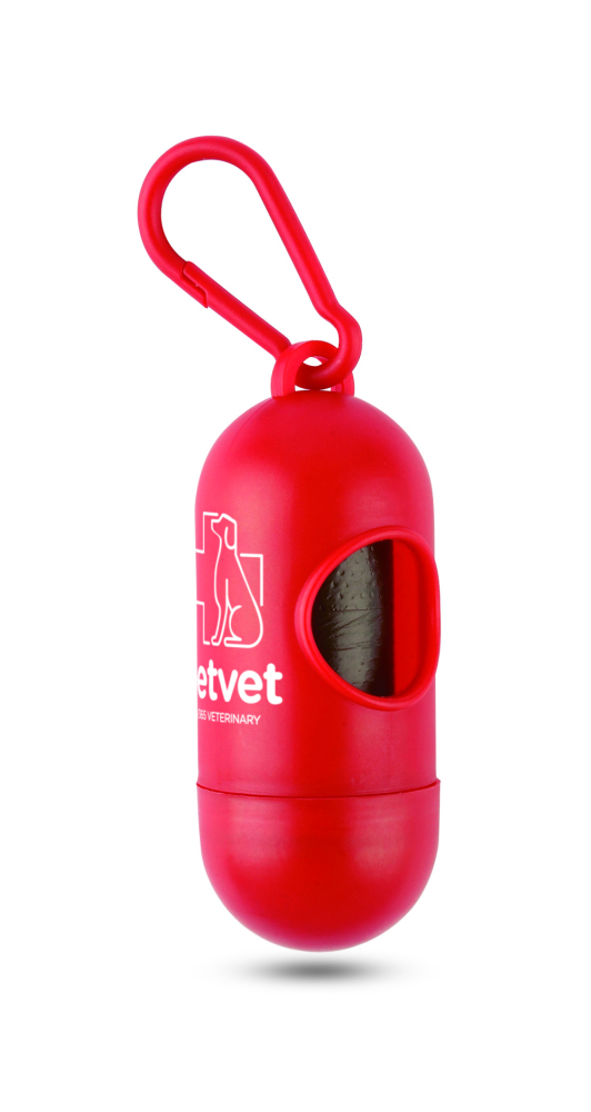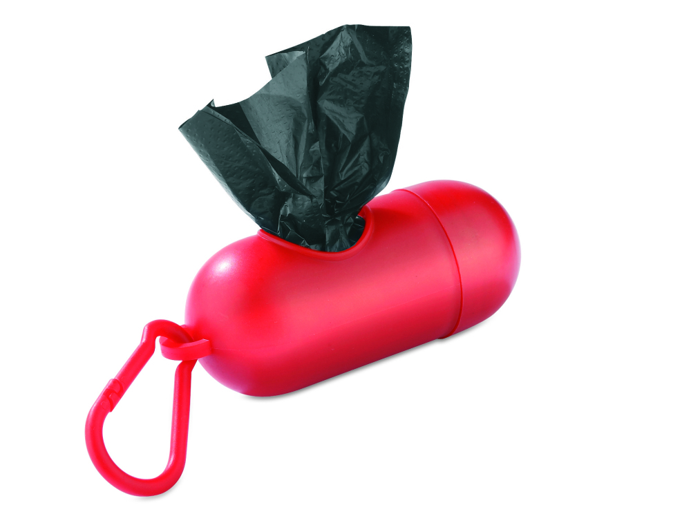 Pojemniczek posiada w zestawie 10 wymiennych torebek z ekologicznego materiału PE oraz karabinek, który można zaczepić o smycz, mając go zawsze przy sobie.