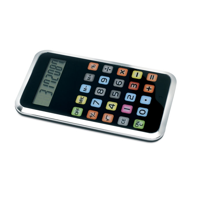 8-cyfrowy kalkulator z kolorowymi, płaskimi klawiszami. Materiał ABS. 1 bateria dołączona.