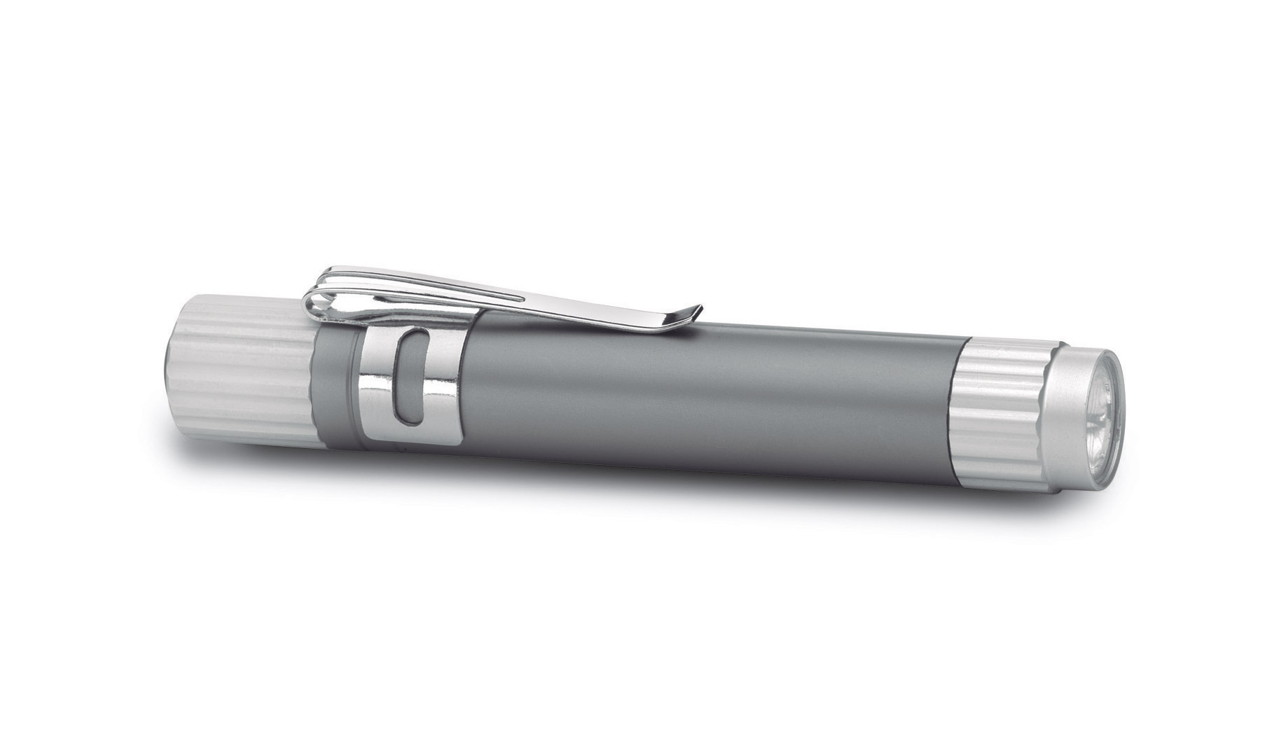 Aluminiowa latarka LED. Matowe wykończenie i metalowy klips. 3 baterie dołączone.