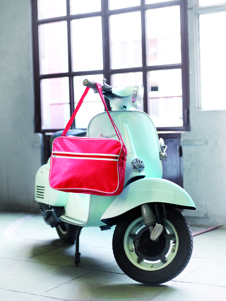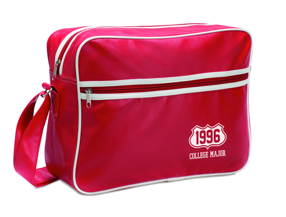 Torba kurierska. Matowo wykończone PVC z białą lamówką i przeszyciem. Kieszeń z przodu zamykana na suwak. Regulowany pasek na ramię.