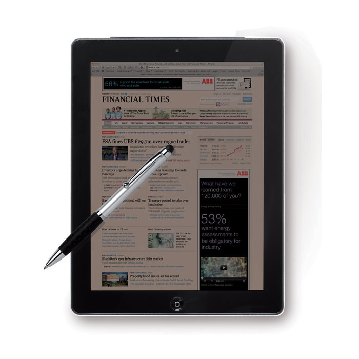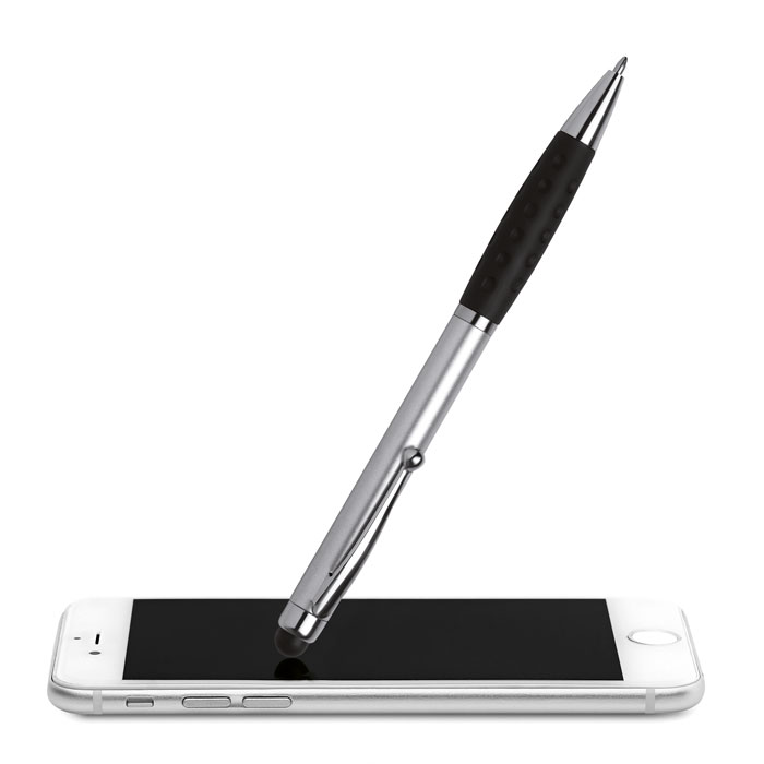 Przekręcany długopis z ABS z metalicznym wykończeniem. Delikatna silikonowa końcówka do urządzeń z ekranem dotykowym. Niebieski wkład.