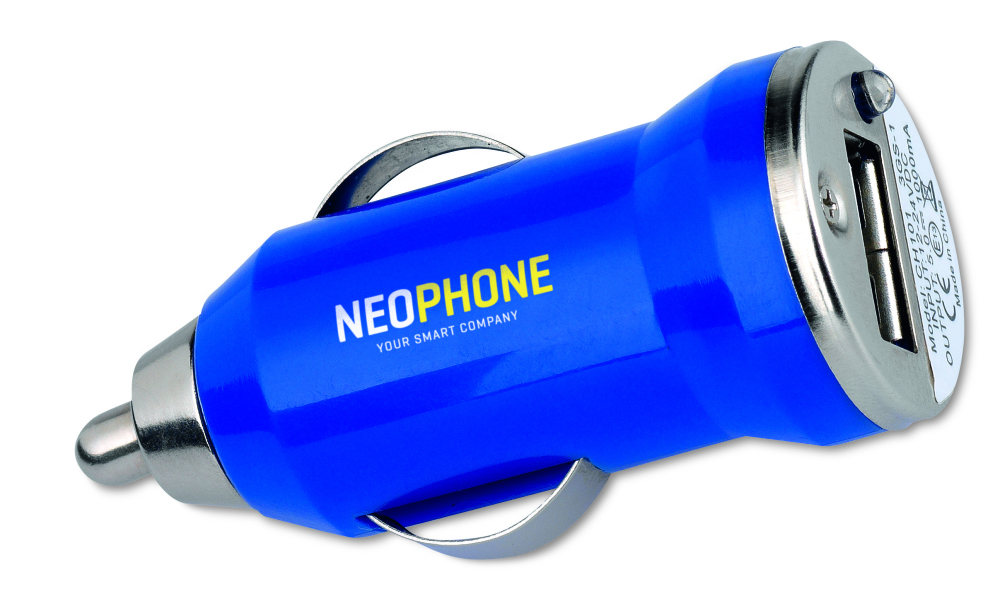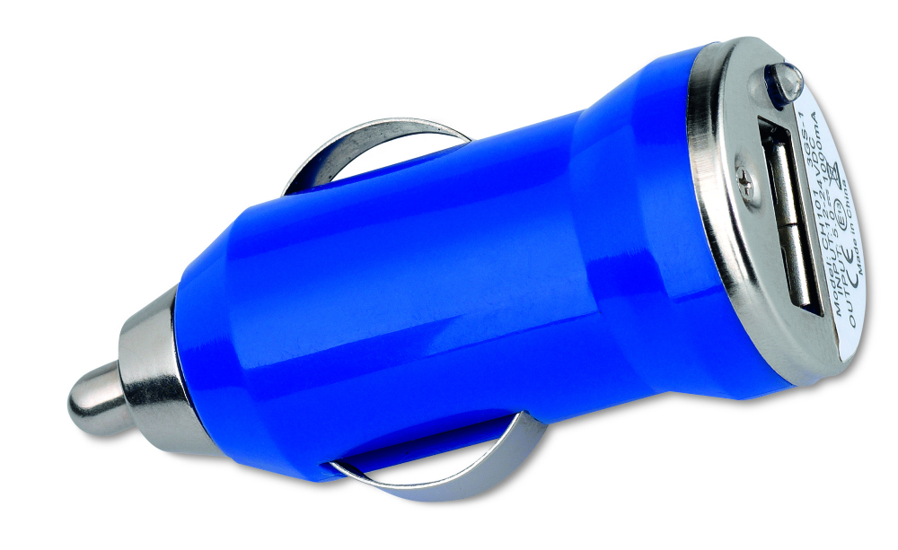 Samochodowa ładowarka USB z czerwoną lampką - wskaźnikiem ładowania. ABS i stop aluminium. Srebrne kartonowe pudełko.
