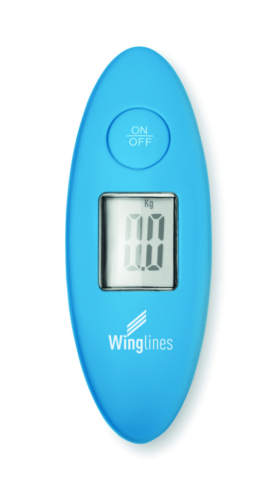 Waga do bagażu w obudowie ABS. Max ciężar 40 kg. Urządzenie podaje wagę w kg lub funtach. Zasilana 1 bateria pastylkową (dołączona). Indywidualnie pakowana w srebrne kartonowe pudełko.