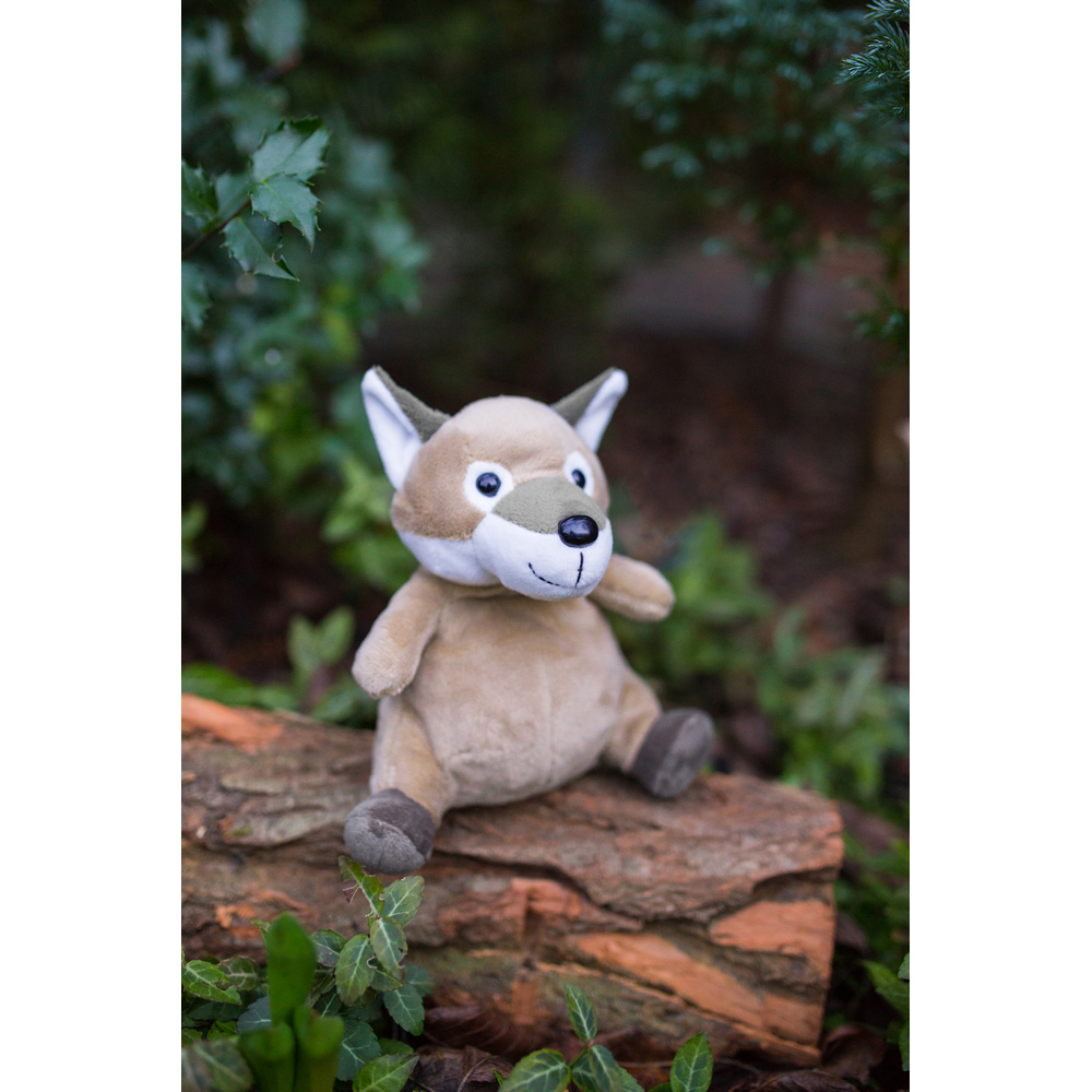 Wilk z możliwością nadruku na brzuchu, obciążenie w postaci drobnych kulek ułatwia utrzymanie równowagi w pozycji siedzącej, produkt wykonany z pluszu