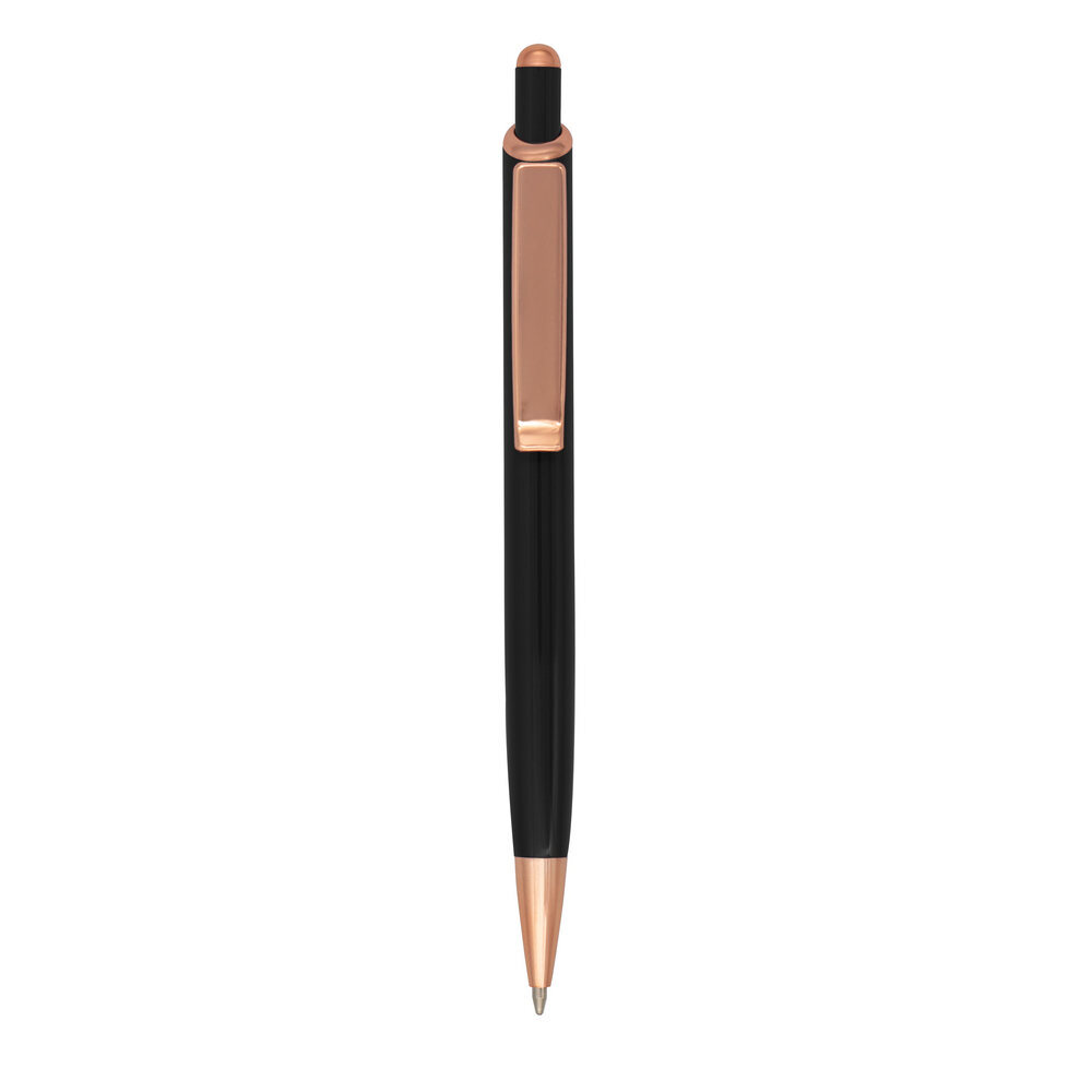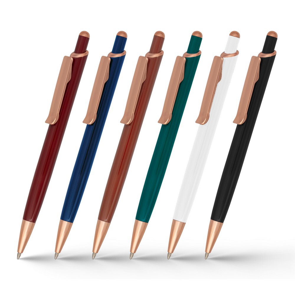 Długopis z kolorowym trzonem i błyszczącymi elementami kolorze różowego złota, wkład w niebieskim kolorze, produkt wykonany z aluminium