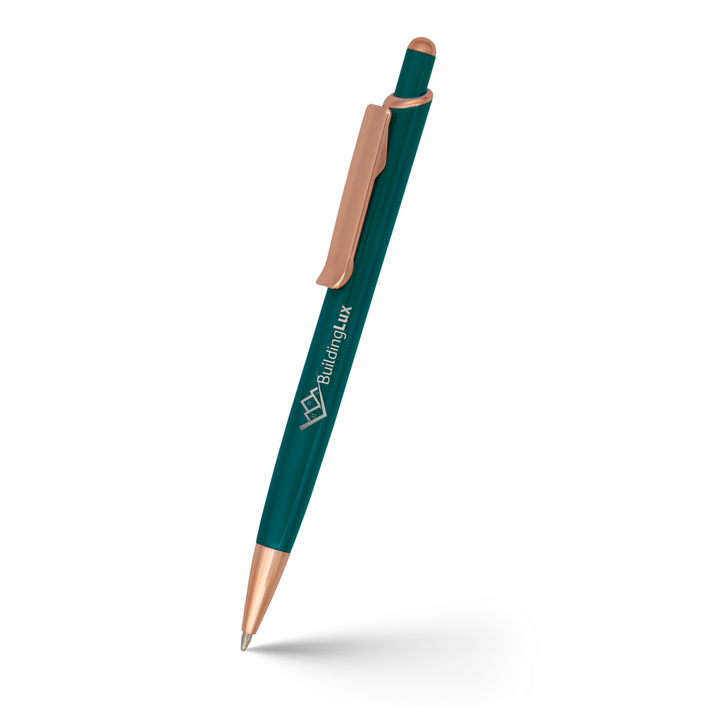 Długopis z kolorowym trzonem i błyszczącymi elementami kolorze różowego złota, wkład w niebieskim kolorze, produkt wykonany z aluminium
