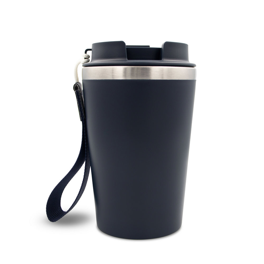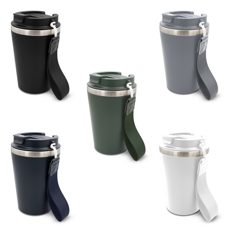 Kubek termiczny 350 ml, posiada podwójne ścianki ze stali nierdzewnej z recyklingu i plastiku, pasek ułatwiający noszenie lub przypięcie, produkt wykonany ze stali nierdzewnej z recyklingu i PP, klasa termiczna: D +leakproof