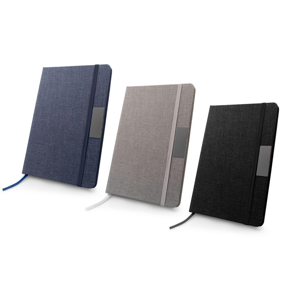 Notatnik w formacie A5, posiada 80 kartek w linie (160 stron), dodatkowe zamknięcie w postaci dopasowanej kolorystycznie elastycznej opaski, posiada metalowy element na grawerunek logotypu lub hasła, twarda okładka wykonana z RPET
