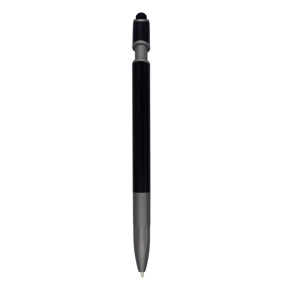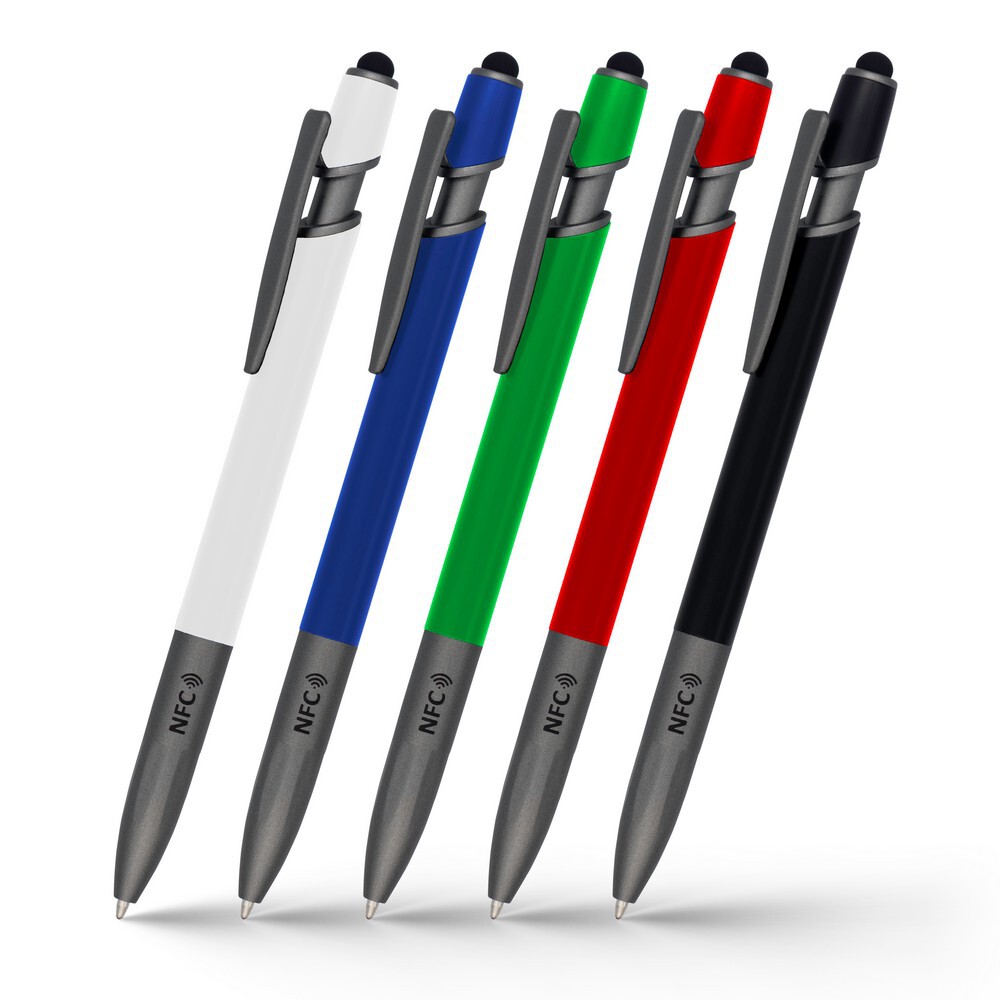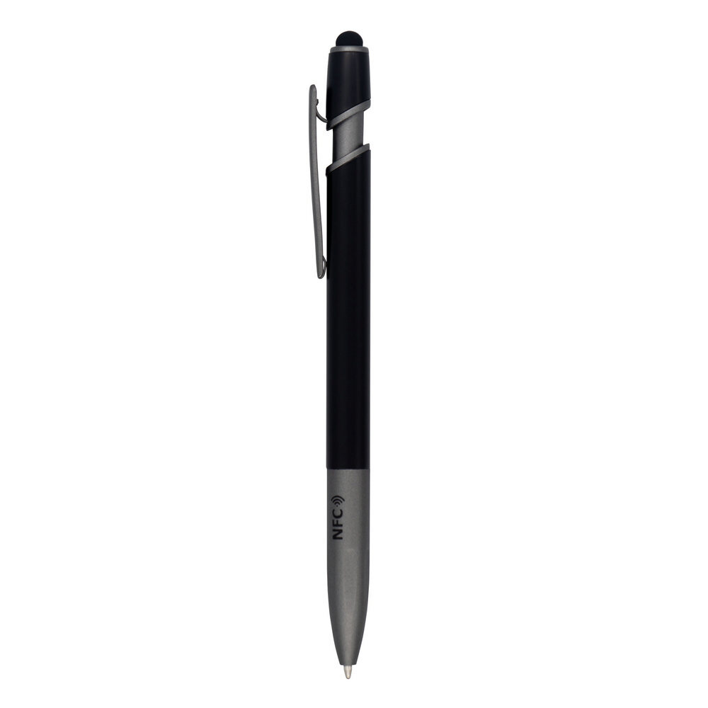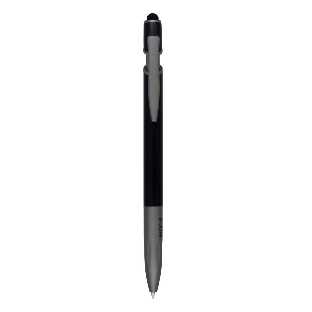 Długopis z chipem NFC (Near Field Communication), działa z urządzeniami posiadającymi technologię NFC, posiada matowy trzon o gumowym wykończeniu i elementy w grafitowym kolorze, końcówka touch pen umożliwia obsługę ekranów dotykowych, wkład w niebieskim kolorze, grawer ukazuje lśniącą powierzchnię. NFC to międzynarodowy standard komunikacji bezprzewodowej wymiany danych na niewielkie odległości. Umieszczony w długopisie chip umożliwia zapisanie na nim np. adresu strony internetowej, który zostanie odczytany przez urządzenie z technologią NFC po zbliżeniu go do logotypu NFC znajdującego się na produkcie. Produkt wykonany z aluminium z recyklingu oraz plastiku.