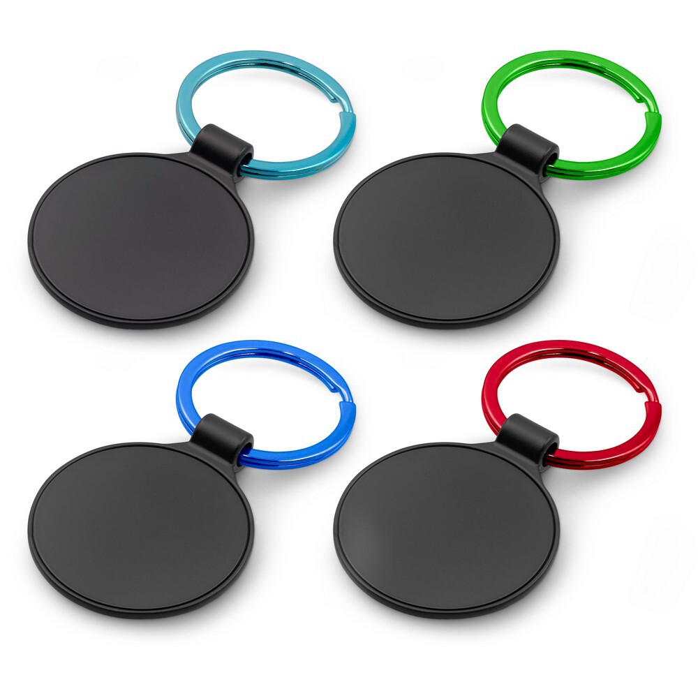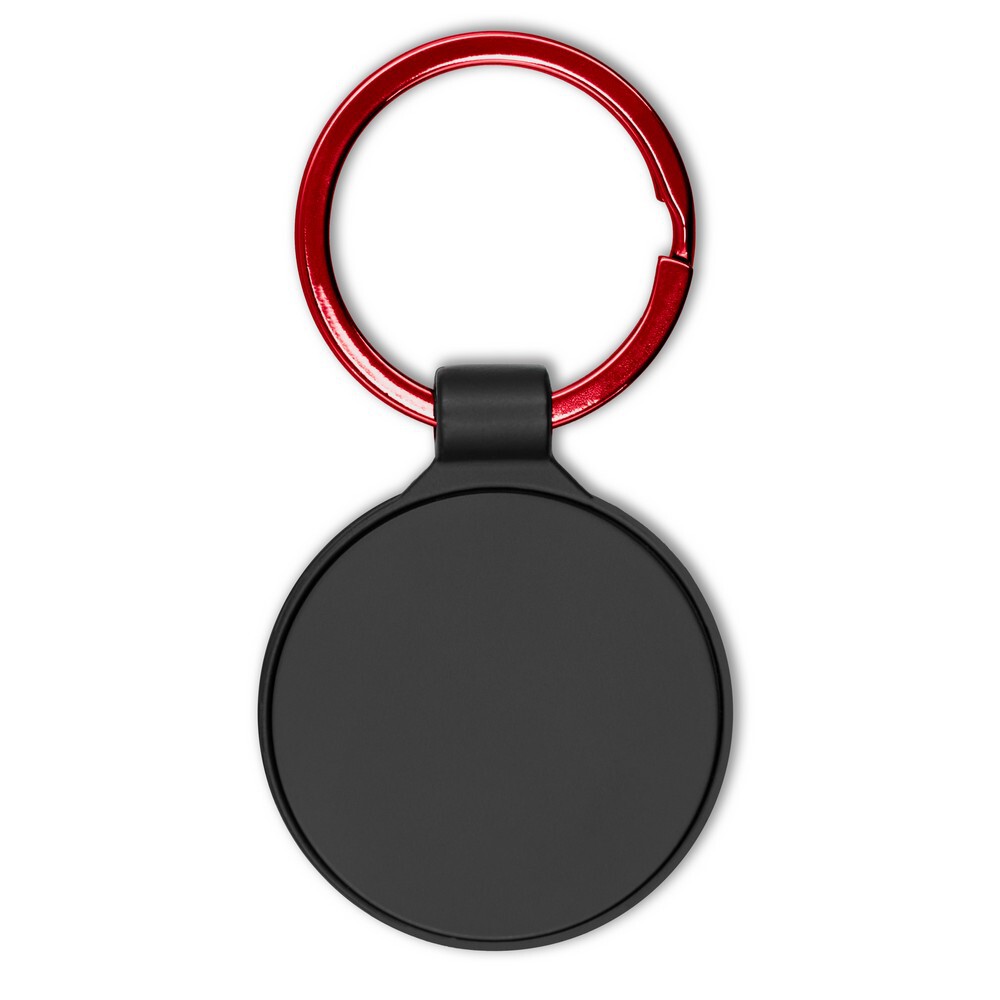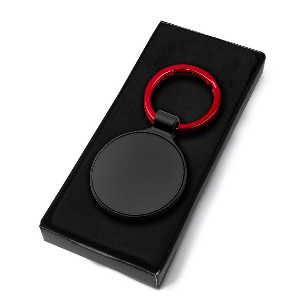 Okrągły brelok do kluczy z dedykowanym miejscem pod znakowanie, grawerunek ukazuje kolorową powierzchnię, produkt wykonany z metalu