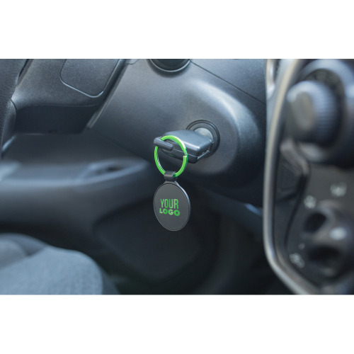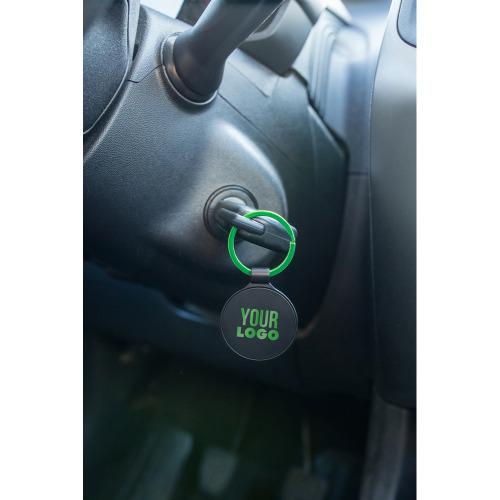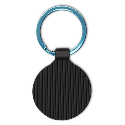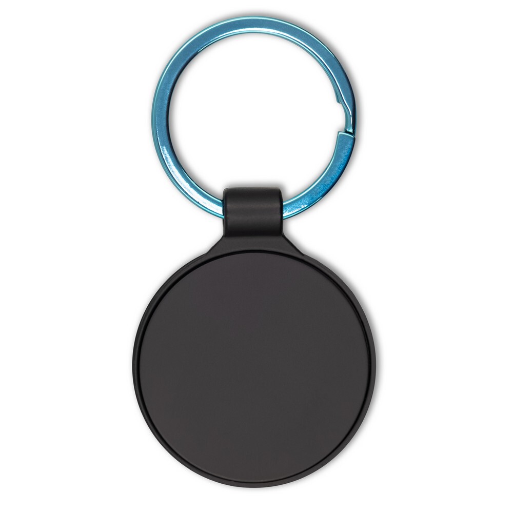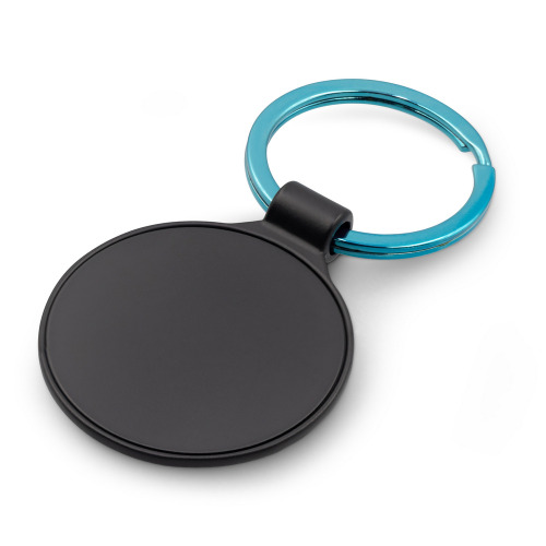 Okrągły brelok do kluczy z dedykowanym miejscem pod znakowanie, grawerunek ukazuje kolorową powierzchnię, produkt wykonany z metalu