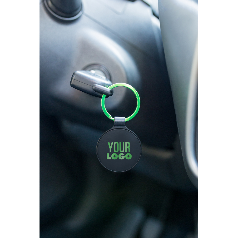 Okrągły brelok do kluczy z dedykowanym miejscem pod znakowanie, grawerunek ukazuje kolorową powierzchnię, produkt wykonany z metalu