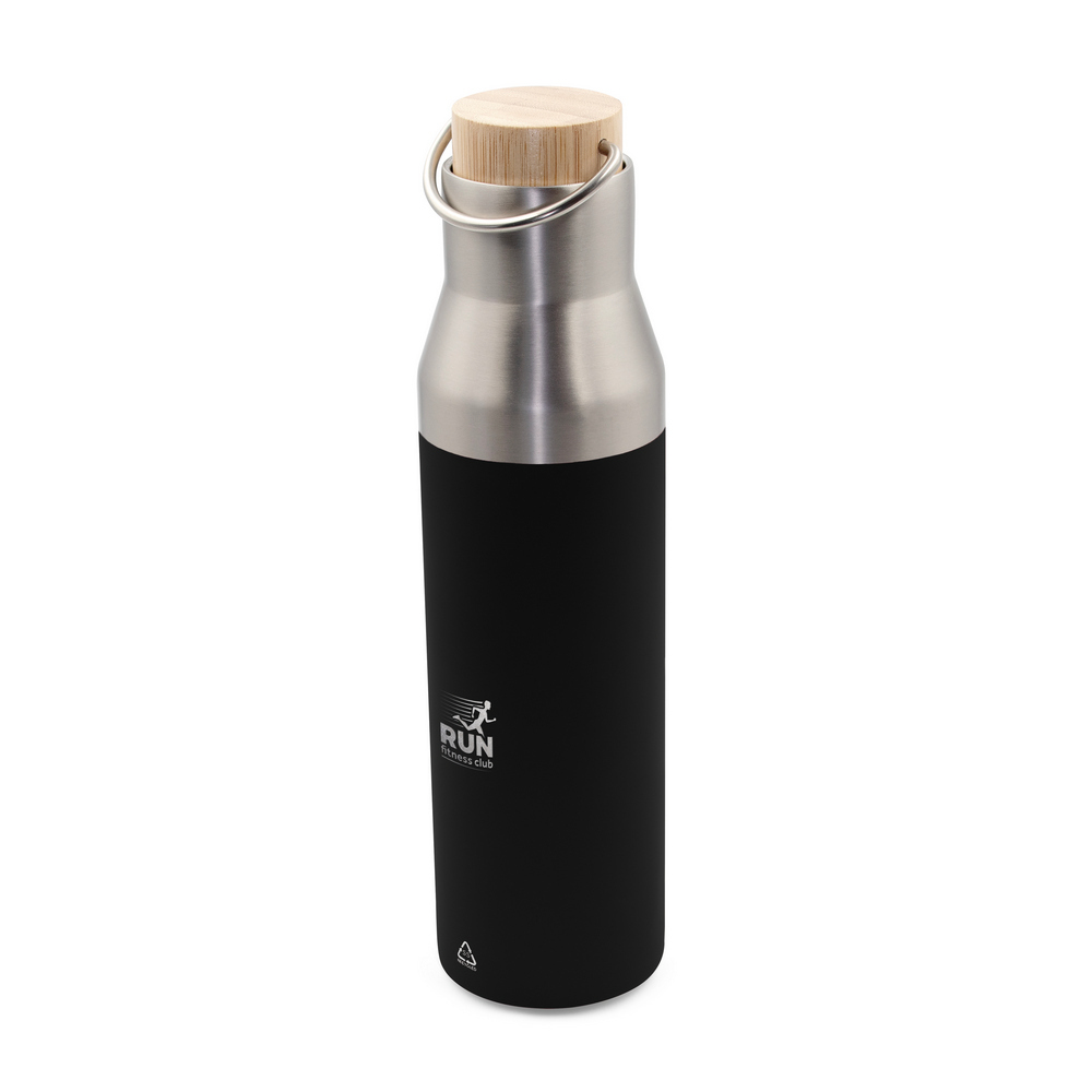 Butelka termiczna 550 ml, posiada podwójne ścianki ze stali nierdzewnej z próżnią między ściankami, co spowalnia oddawanie temperatury na zewnątrz, zachowując funkcje termosu, zakrętka z bambusowym elementem i metalowym uchwytem ułatwiającym noszenie lub przypięcie, ikona stali nierdzewnej z recyklingu na obudowie, produkt wykonany m.in. ze stali nierdzewnej recyklingu, klasa termiczna: A +leakproof
