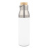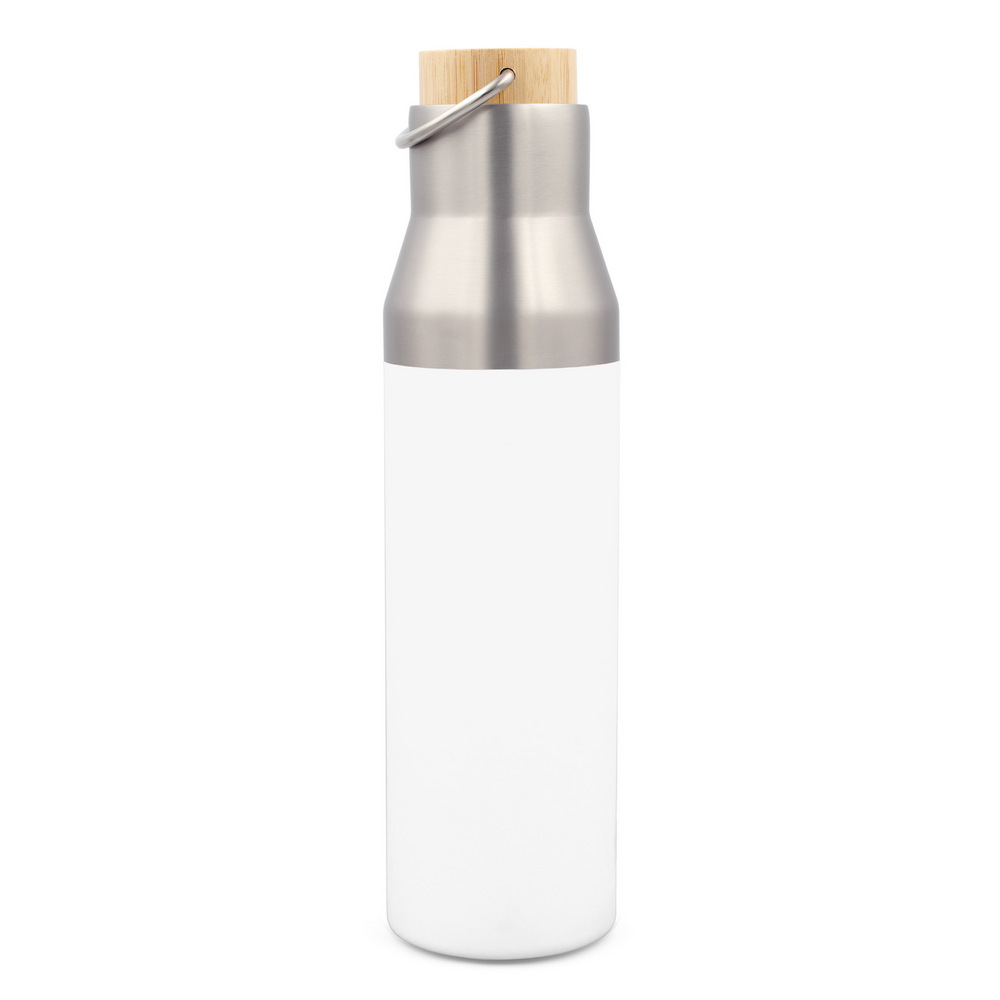 Butelka termiczna 550 ml, posiada podwójne ścianki ze stali nierdzewnej z próżnią między ściankami, co spowalnia oddawanie temperatury na zewnątrz, zachowując funkcje termosu, zakrętka z bambusowym elementem i metalowym uchwytem ułatwiającym noszenie lub przypięcie, ikona stali nierdzewnej z recyklingu na obudowie, produkt wykonany m.in. ze stali nierdzewnej recyklingu, klasa termiczna: A +leakproof