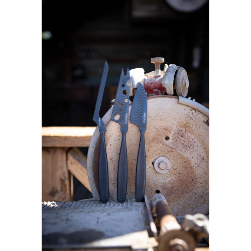 Zestaw do sera, wykonany ze stali nierdzewnej, unikatowy wzór w kształcie diamentów zapobiega przywieraniu sera, skórzane etui w komplecie, posiada 10-letnią gwarancję, wyłącznie mycie ręczne
