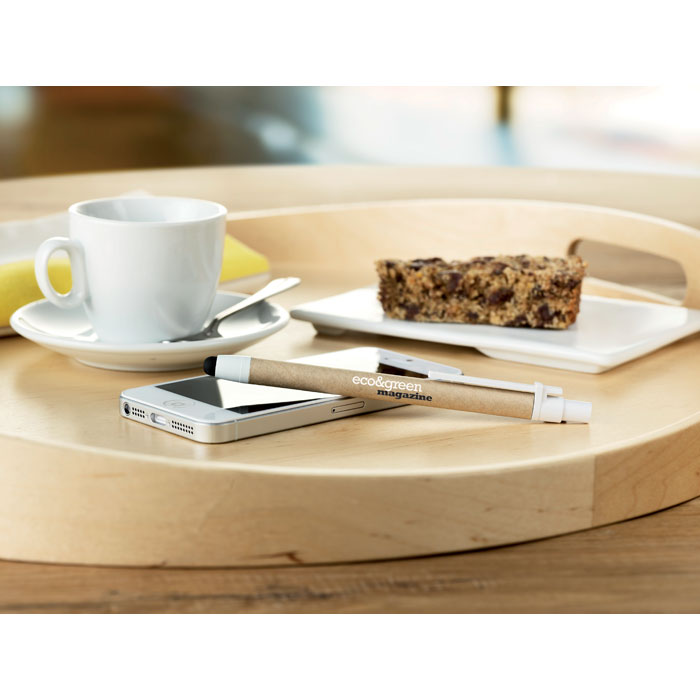 Automatyczny, wykonany z kartonu przyciskany długopis zakończony klipem z ABS-u. Niebieski wkład.