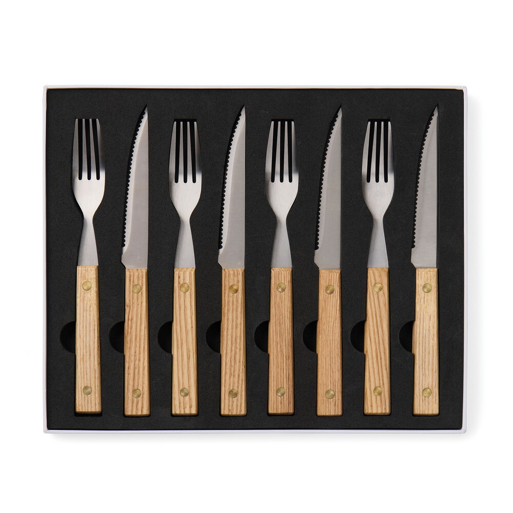 Zestaw 8 sztućców grillowych, design inspirowany skandynawską prostotą, wykonany ze stali nierdzewnej oraz drewna jesionowego z certyfikatem FSC®, 4 ostre noże oraz 4 widelce z wygodnym uchwytem