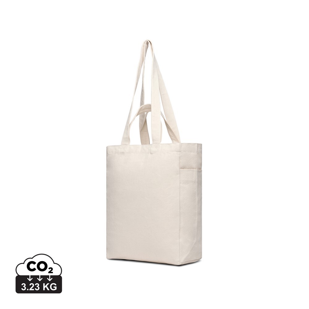 Torba na zakupy, wykonana w 70% z płótna z bawełny z recyklingu i w 30% z poliestru z recyklingu, płótno z recyklingu nie zawiera związków chemicznych pozostałych po barwieniu lub wybielaniu, przegroda główna zamykana na zamek błyskawiczny, posiada krótkie uchwyty oraz długie uchwyty umożliwiające noszenie na ramieniu