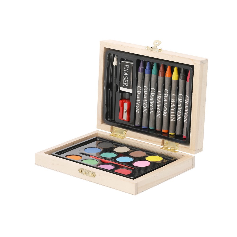 Zestaw do malowania i rysowania, 24 el., w zestawie kredki świecowe, ołówek, gumka do mazania, temperówka, farbki oraz pędzelek, ozdobne pudełko wykonane z drewna