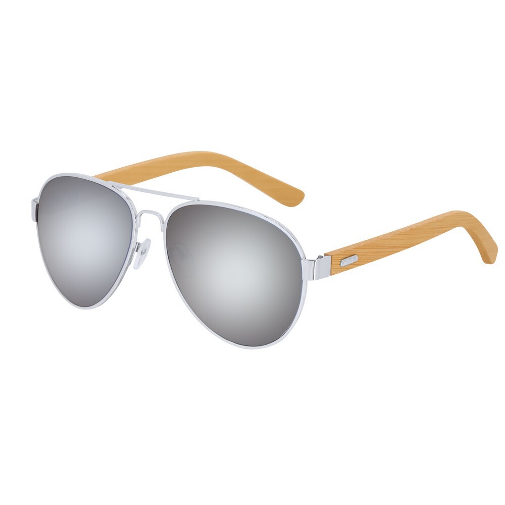 Okulary przeciwsłoneczne z filtrem UV400, posiadają lustrzane szkła oraz bambusowe zauszniki, etui z mikrofibry w komplecie, produkt wykonany z metalu i bambusa