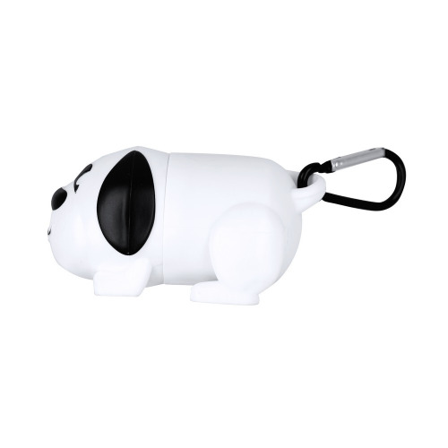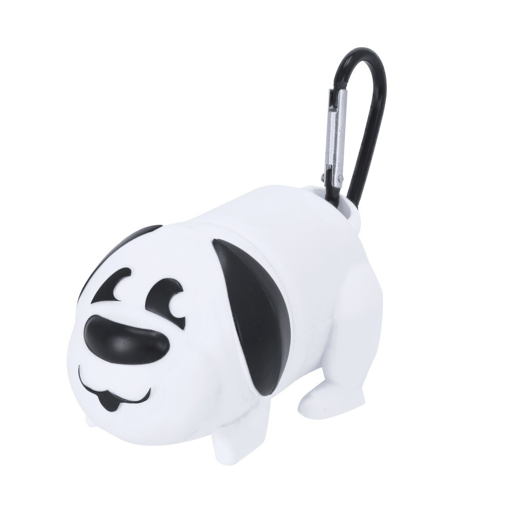 Zasobnik z 15 woreczkami na psie odchody, zasobnik w kształcie psa, posiada karabińczyk umożliwiający przypinanie, produkt wykonany z PP