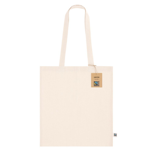 Torba na zakupy, posiada długie uchwyty umożliwiające noszenie na ramieniu, produkt wykonany z bawełny o gramaturze 140 g/m², zgodny z certyfikatem FAIRTRADE