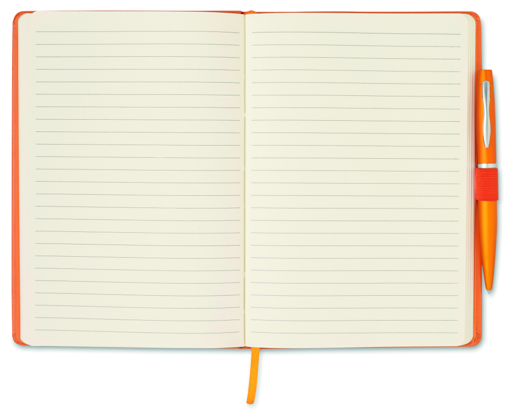 Zawiera 72 kartki w linie, a w zestawie jest dołączony metalowy długopis z niebieskim wkładem, który można zahaczyć o gumkę notatnika i nosić razem.