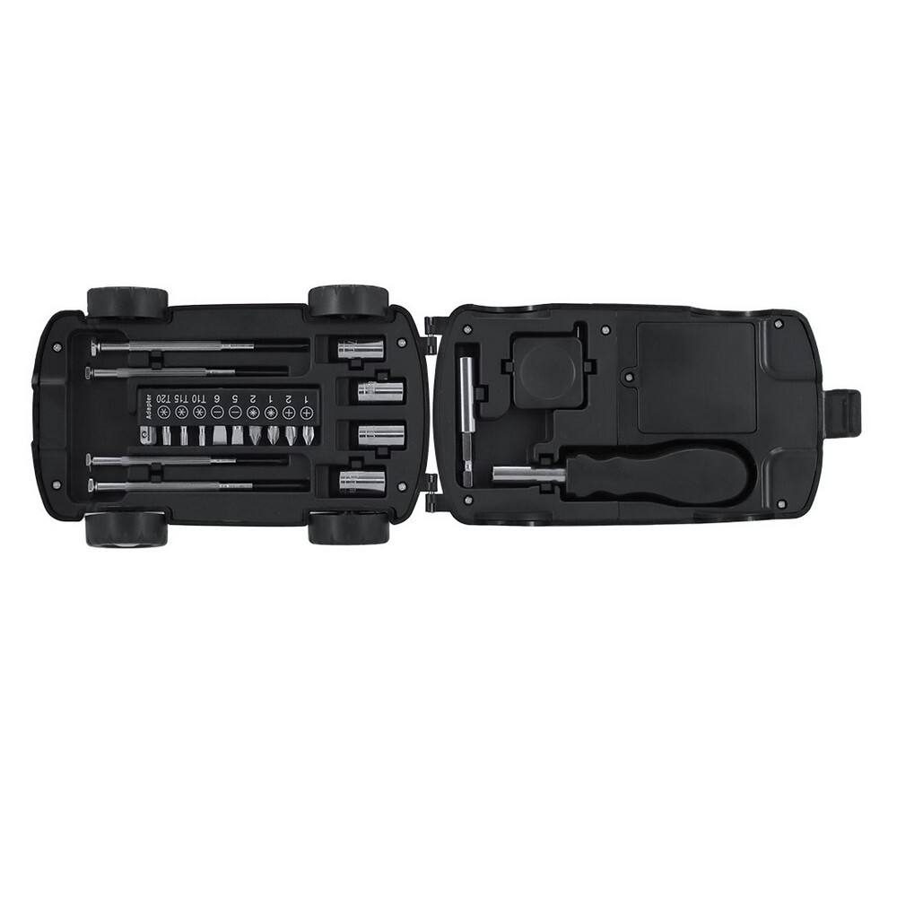 Zestaw narzędzi w opakowaniu w kształcie samochodu, 20 elementów, miara 1m, rączka śrubokręta, 9 końcówek wkrętakowych, 4 precyzyjne śrubokręty, posiada lampkę 2 LED, produkt wykonany z ABS
