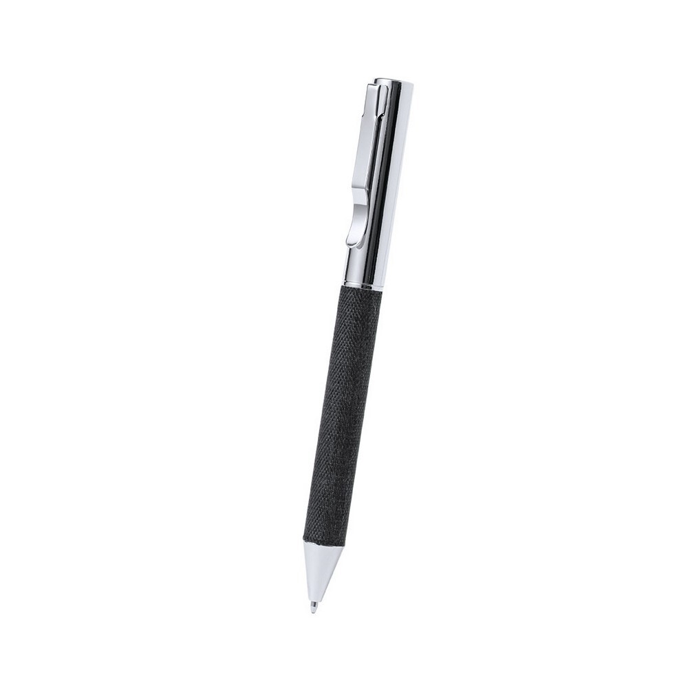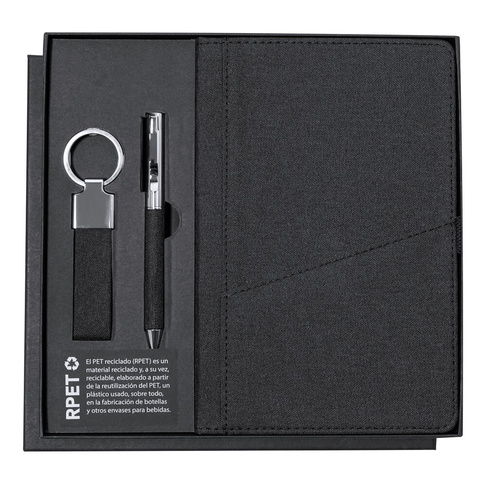 Zestaw upominkowy, w zestawie brelok, notatnik w formacie ok. A5, posiada 100 kartek w linie i twardą okładkę, długopis posiada wkład w niebieskim kolorze, czarne pudełko podarunkowe w komplecie, produkt wykonany z poliestru RPET oraz metalu
