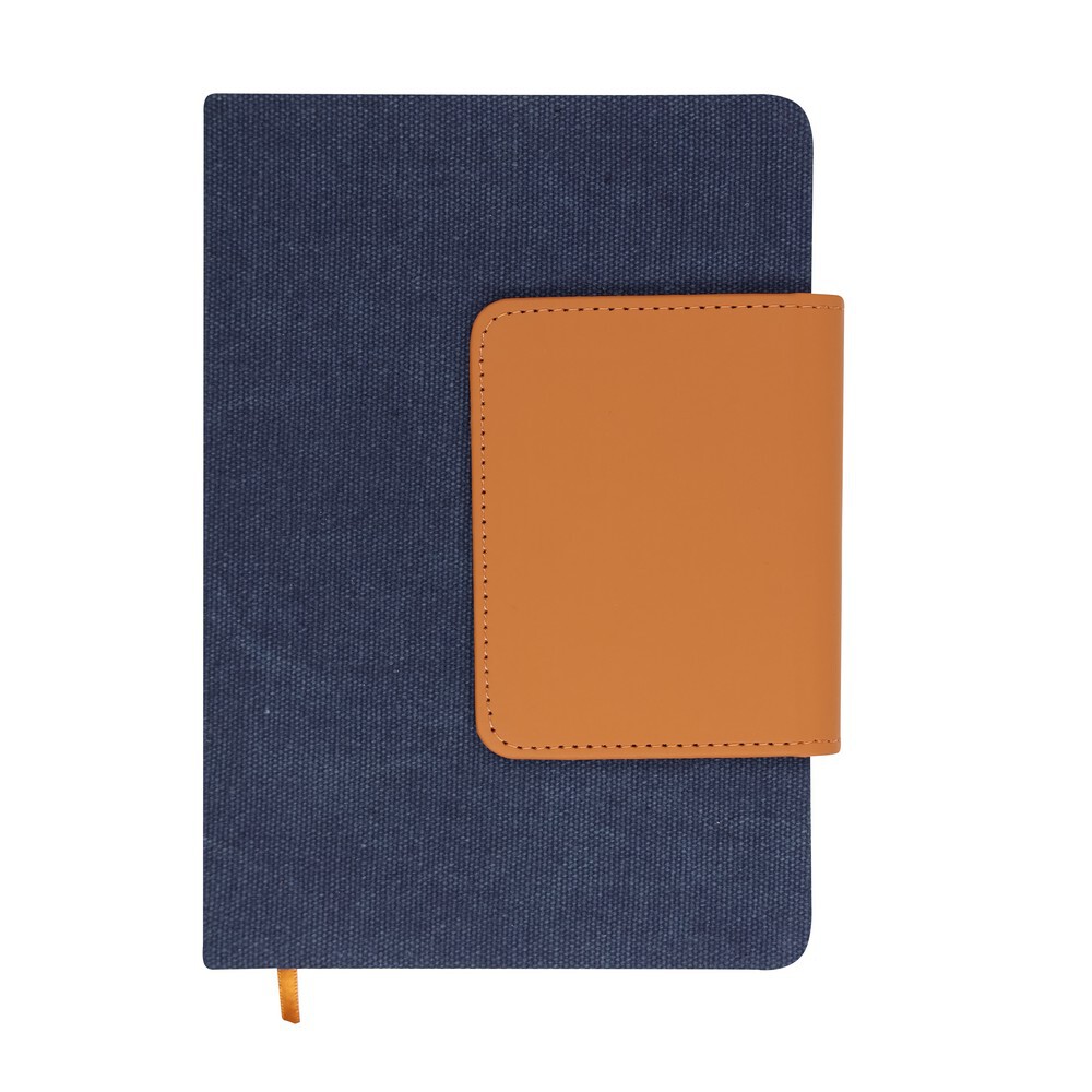 Notatnik w formacie ok. A5 z twardą okładką, posiada 80 pustych kartek oraz magnetyczne zamknięcie, produkt wykonany z płótna z recyklingu oraz PU z recyklingu